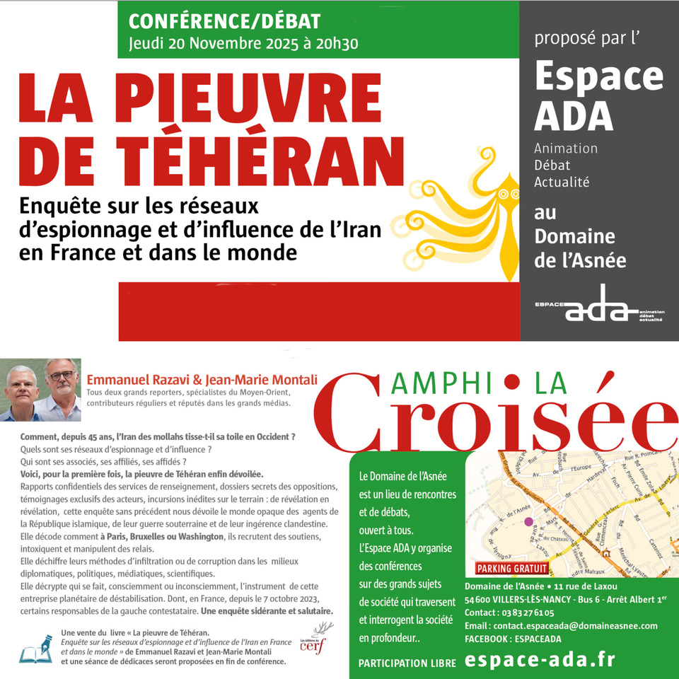 Une vente du livre « La pieuvre de Téhéran. Enquête sur les réseaux d’espionnage et d’influence de l’Iran en France et dans le monde » de Emmanuel Razavi et Jean-Marie Montali (Editions du Cerf) et une séance de dédicaces seront proposées en fin de conférence.